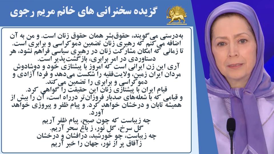 آری این زن ایرانی است که امروز با پیشتازی خود و دوشادوش مردان ایران زمین، ولایتفقیه را شکست میدهد و فردا آزادی و دموکراسی و برابری را تضمین میکند.