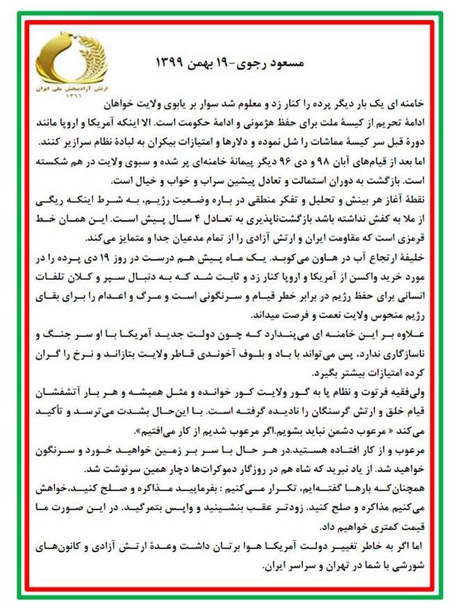 [yjsgnote color="yellow" close="no" title=" مسعود رجوی -۱۹ بهمن ۱۳۹۹" border="default" radius="radiusb10" icon=""] خامنهای یک بار دیگر پرده را کنار زد و معلوم شد سوار بر یابوی ولایت خواهان ادامه تحریم از کیسهٔ ملت برای حفظ هژمونی و ادامه حکومت است. الا اینکه آمریکا و اروپا مانند دورهٔ قبل سر کیسه مماشات را شل نموده و دلارها و امتیازات بیکران به لبادهٔ نظام سرازیر کنند. اما بعد از قیامهای آبان۹۸ و دی۹۶ دیگر پیمانه خامنهای پر شده و سبوی ولایت درهم شکسته است. بازگشت به دوران استمالت و تعادل پیشین سراب و خواب و خیال است. نقطهٔ آغاز هر بینش و تحلیل و تفکر منطقی درباره وضعیت رژیم، به شرط اینکه ریگی از ملا به کفش نداشته باشد بازگشتناپذیری به تعادل ۴سال پیش است. این همان خط قرمزی است که مقاومت ایران و ارتش آزادی را از تمام مدعیان جدا و متمایز میکند. خلیفهٔ ارتجاع آب در هاون میگوید. یک ماه پیش هم درست در روز ۱۹دی پرده را در مورد خرید واکسن از آمریکا و اروپا کنار زد و ثابت شد که بهدنبال سپر و کلان تلفات انسانی برای حفظ رژیم در برابر خطر قیام و سرنگونی است و مرگ و اعدام را برای بقای رژیم منحوس ولایت نعمت و فرصت میداند. علاوه بر این خامنهای میپندارد که چون دولت جدید آمریکا با او سر جنگ و ناسازگاری ندارد، پس میتواند با باد و بلوف آخوندی قاطر ولایت بتازاند و نرخ را گران کرده امتیازات بیشتر بگیرد. ولیفقیه فرتوت و نظام پا به گور ولایت کور خوانده و مثل همیشه و هر بار آتشفشان قیام خلق و ارتش گرسنگان را نادیده گرفته است. با این حال بهشدت میترسد و تأکید میکند «مرعوب دشمن نباید بشویم. اگر مرعوب شدیم از کار میافتیم». مرعوب و از کار افتاده هستید.در هر حال با سر بر زمین خواهید خورد و سرنگون خواهید شد. از یاد نبرید که شاه هم در روزگار دمکراتها دچار همین سرنوشت شد. همچنان که بارها گفتهایم، تکرار میکنیم : بفرمایید مذاکره و صلح کنید، خواهش میکنیم مذاکره و صلح کنید. زودتر عقب بنشینید و واپس بتمرگید. در این صورت ما قیمت کمتری خواهیم داد. اما اگر بهخاطر تغییر دولت آمریکا هوا برتان داشت وعده ارتش آزادی و کانونهای شورشی با شما در تهران و سراسر ایران.[/yjsgnote]