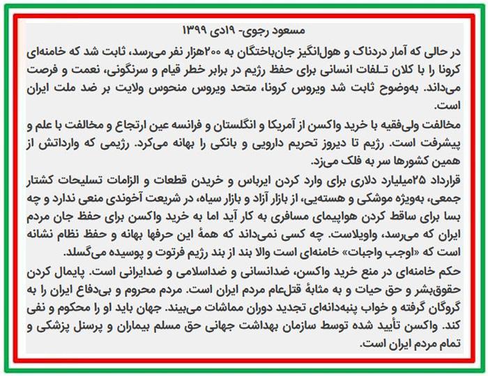 مسعود رجوی - ثابت شد که خامنهای کرونا را با کلان تلفات انسانی برای حفظ رژیم در برابر خطر قیام و سرنگونی، نعمت و فرصت میداند