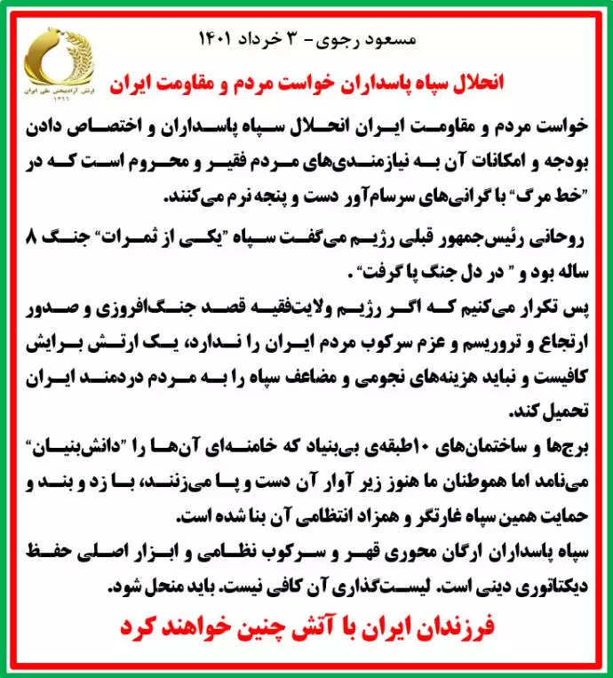 خواست مردم و مقاومت ایران انحلال سپاه پاسداران و اختصاص دادن بودجه و امکانات آن به نیازمندیهای مردم فقیر و محروم است که در ”خط مرگ“ با گرانیهای سرسامآور دست و پنجه نرم میکنند.