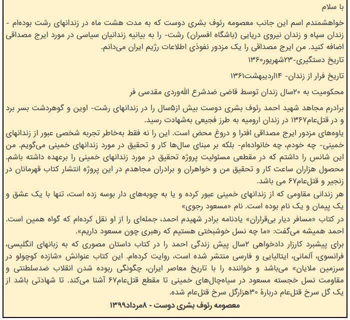 ۲- ما معتقدیم چنین اقدامی برخلاف راه و اهداف همهٔ خونینکفنان و جانباختگان تابستان (۶۷) و تمامی شهیدان و شکنجهشدگان و مقاومتکنندگان در برابر رژیم بوده و آنرا در راستای اهداف وزارت اطلاعات رژیم آخوندی و مزدوری برای آن میدانیم.