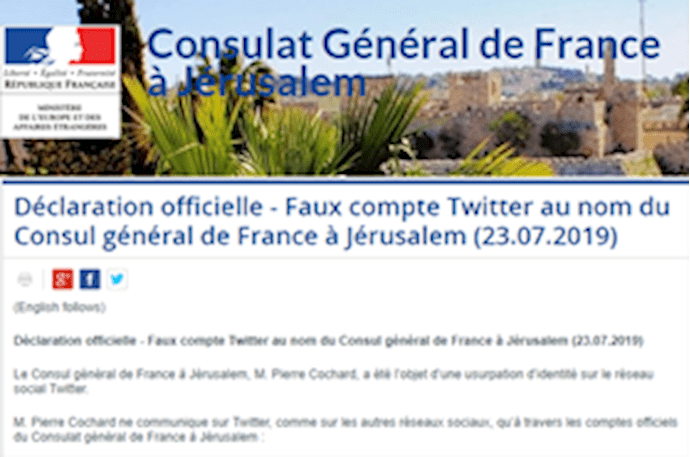۶- این اولین بار نیست که رژیم درمانده آخوندها به چنین تشبثات رسوا و ناشیانه‌ای مبادرت می‌کند. رژیم در ۲۶تیر ۹۸ با استفاده از توئیت جعلی به‌نام سرکنسول فرانسه در بیت‌المقدس از «سفر خانم مریم رجوی به اسرائیل» خبر داد. متعاقباً وزارت‌خارجه فرانسه «حساب توئیتری قلابی از سوی سرکنسول فرانسه در بیت المقدس» را تکذیب و اعلام کرد: «سرکنسول فرانسه در بیت‌المقدس آقای پیر کوشار سوژه یک دزدی هویت در شبکه اجتماعی توئیتر واقع شده است».
