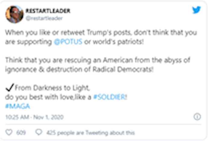 وزارت اطلاعات با استفاده از چند حساب ذینفوذ، بهموازات موضوع انتخابات ریاستجمهوری آمریکا، بهطور مستمر اطلاعات منفی علیه مخالفان ایرانی منتشر میکند. در بسیاری از پستها دونالد ترامپ، پمپئو و سایر رهبران شناختهشدهٔ دنیا را مخاطب قرار میدهند و بهاین شیوه بهدنبال بهرسمیت شناختهشدن و گسترش پیام هستند.