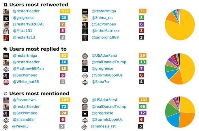 حسابهای توئیتری ریاستارت لیدر @restartleader، ریستارت میگا @restartmiga و سماهوس @semahos، حسابهای اصلی در کمپین توزیع اطلاعات غلط و دروغ در مورد ایرانیان مخالف هستند که همزمان با انجام توئیت با استفاده از هشتگها و پستهایی در حمایت از دولت ترامپ اقدام میکنند. سایت وویس آف ریاستارت voiceofrestart.com و کانال یوتیوب و صفحات فیسبوک ریاستارت بهشدت سازمان مجاهدین خلق را مورد انتقاد قرار میدهند