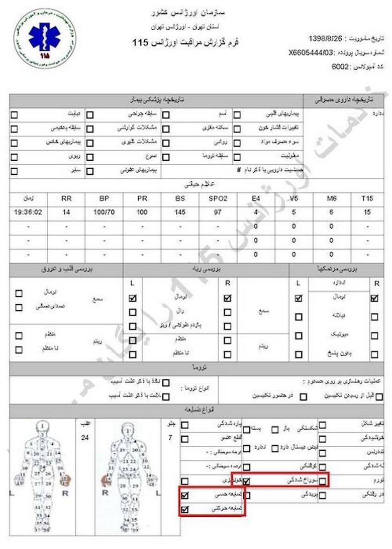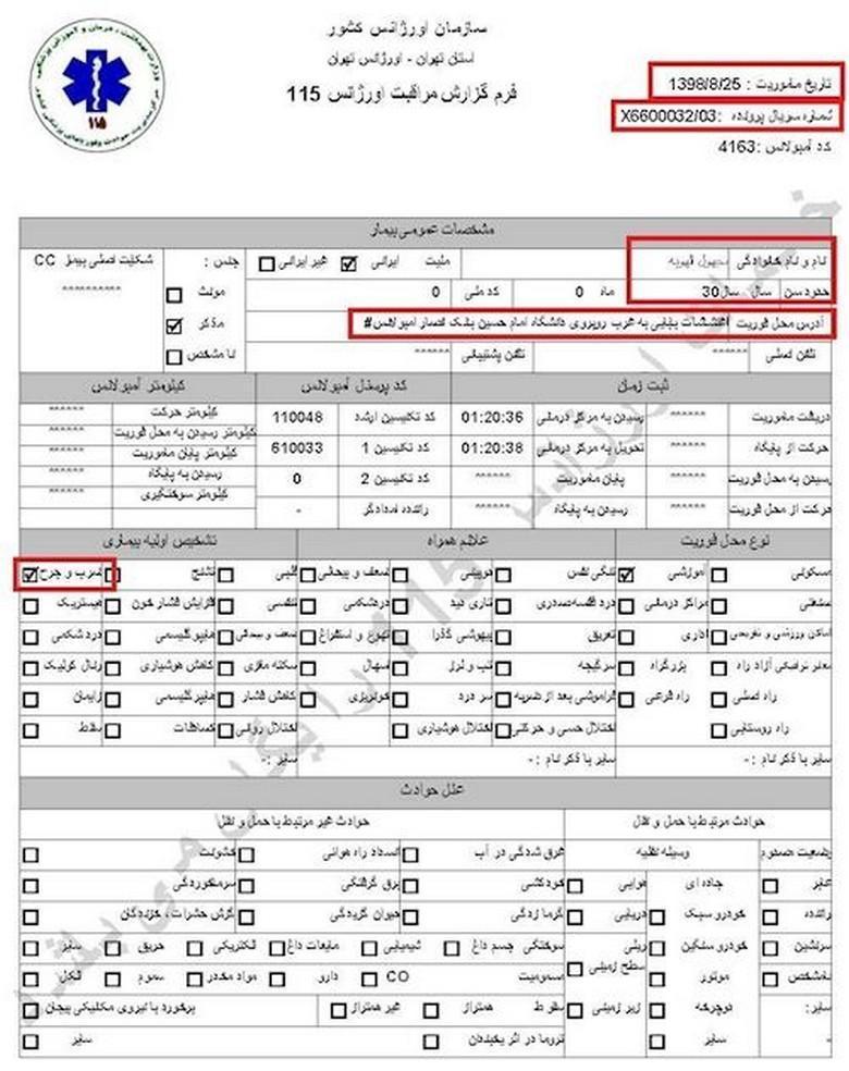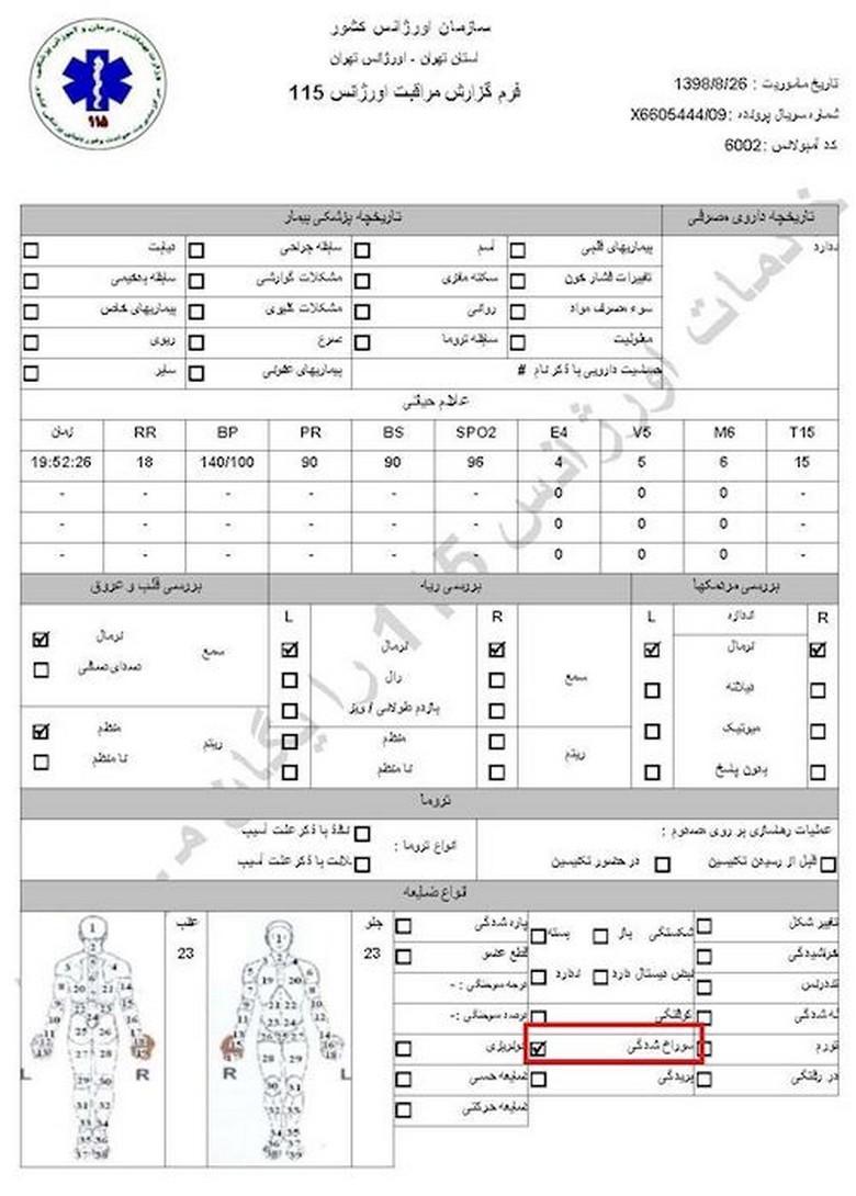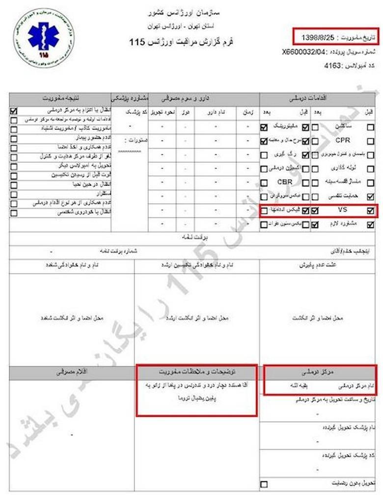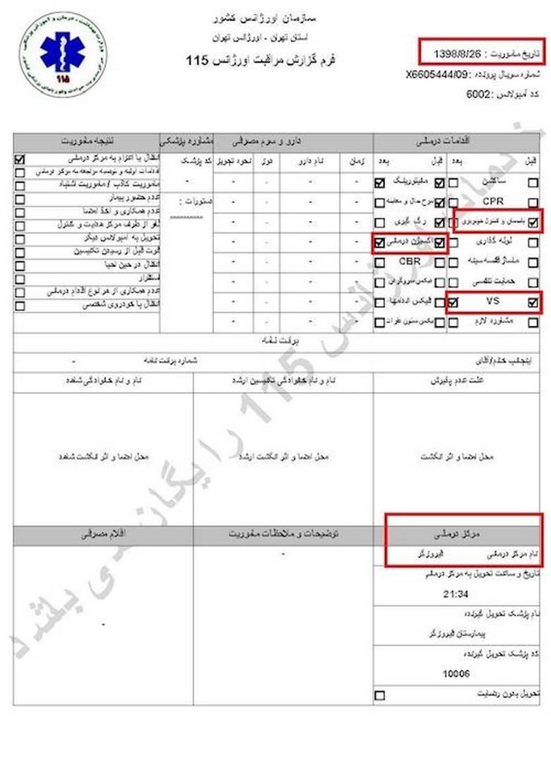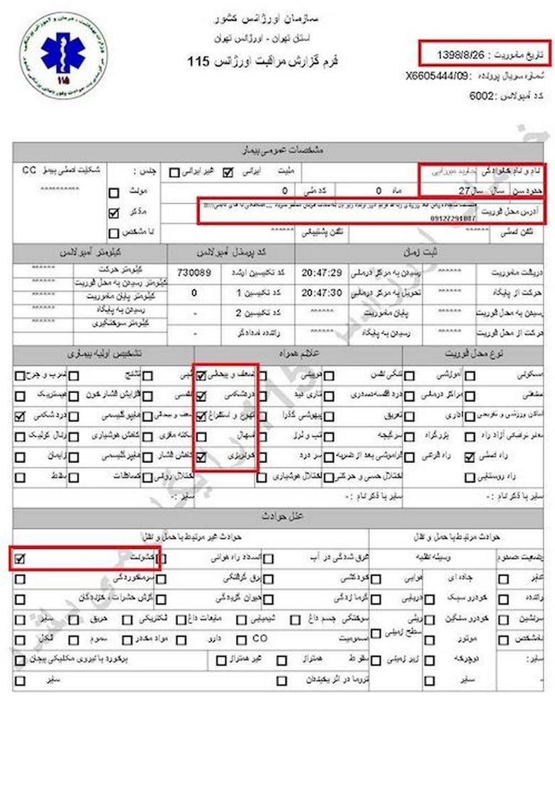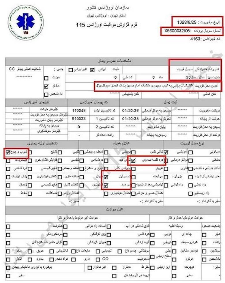 سند شماره ۱- تاریخ مأموریت ۲۶آبان۱۳۹۸، کد آمبولانس ۶۰۰۲، نام و نام خانوادگی جاوید میرزایی، سن ۲۷سال، آدرس محل فوریت: اغتشاشات جاده وهن آباد ورودی رباط کریم دور بزنید زیر پل به سمت اتوبان مستقر شوید/ هماهنگی با آقای قائمی ۰۹۱۲۷۲۹۱۰۸۷/ اعزام به بیمارستان فیروزگر، ساعت ۲۱ و ۳۴دقیقه