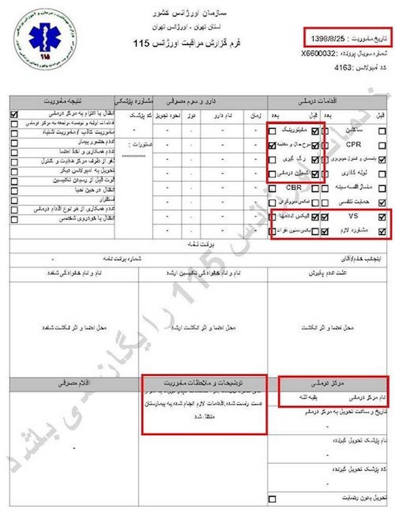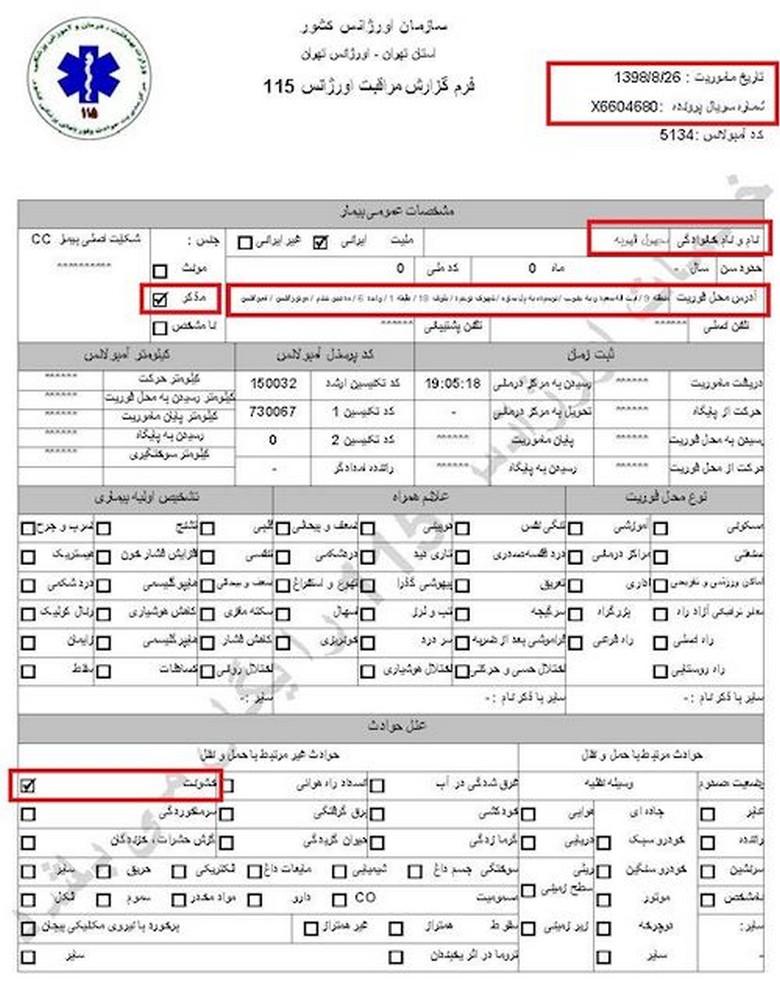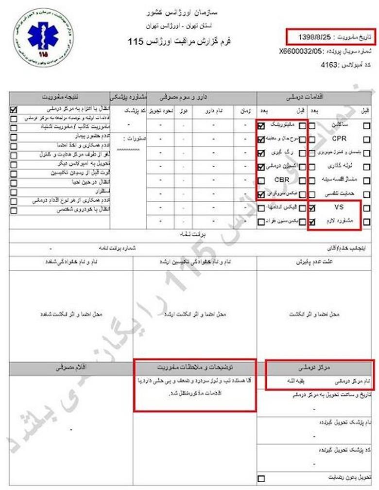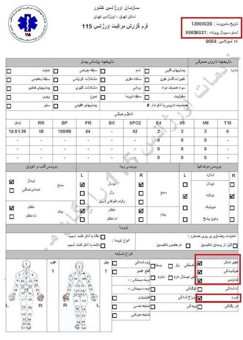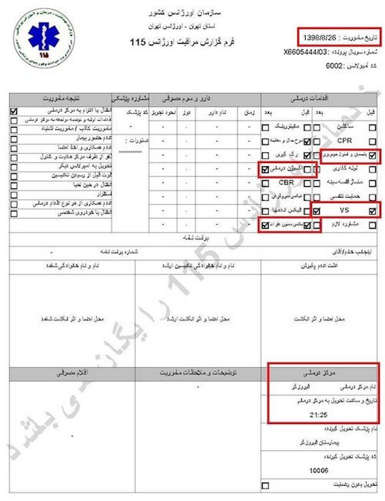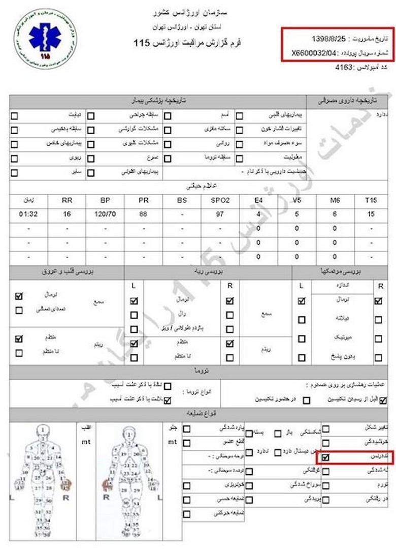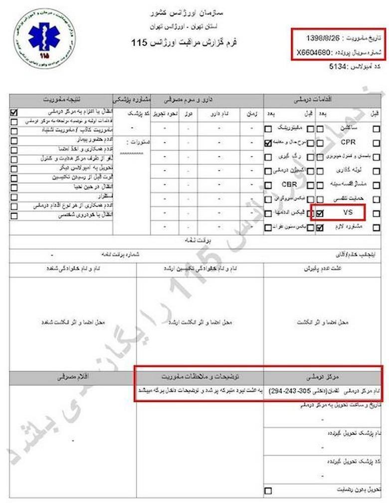 سند شماره ۱- تاریخ مأموریت ۲۶آبان۱۳۹۸، کد آمبولانس ۶۰۰۲، نام و نام خانوادگی جاوید میرزایی، سن ۲۷سال، آدرس محل فوریت: اغتشاشات جاده وهن آباد ورودی رباط کریم دور بزنید زیر پل به سمت اتوبان مستقر شوید/ هماهنگی با آقای قائمی ۰۹۱۲۷۲۹۱۰۸۷/ اعزام به بیمارستان فیروزگر، ساعت ۲۱ و ۳۴دقیقه