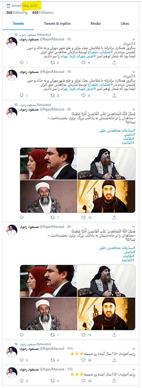 مثلا این اکانت که در همین خردادماه به نام رهبری مقاومت ساختهشده و هر توئیت خودش را بازتوئیت میکند:
