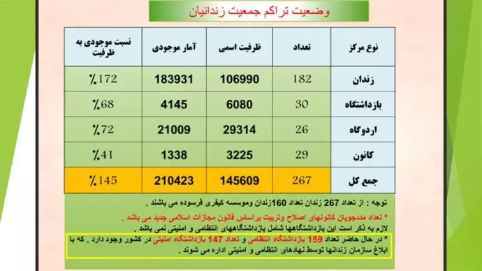 شایان یادآوری است که طبق گزارش «دفتر آمار» سازمان زندانها در تیر ۱۳۹۹، علاوه بر ۲۶۷ زندان و بازداشتگاه و اردوگاه و کانونهای موسوم به اصلاح و تربیت متعلق به سازمان زندانها، نیروی انتظامی ۱۵۹ بازداشتگاه و وزارت اطلاعات ۱۴۷ بازداشتگاه افزوده و جداگانه داشته که اکنون بیشتر شده است.
