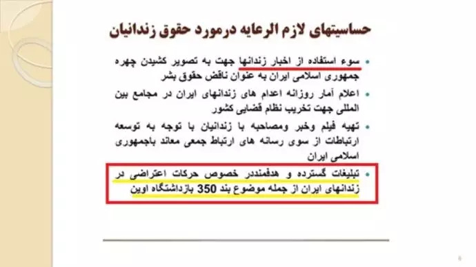 یک نمونه از ”حساسیت‌های لازم الرعایه“ سازمان زندانهای ولایت‌فقیه: ”تبلیغات گسترده و هدفمند در خصوص حرکات اعتراضی در زندانهای ایران از جمله موضوع بند ۳۵۰ بازداشتگاه اوین“