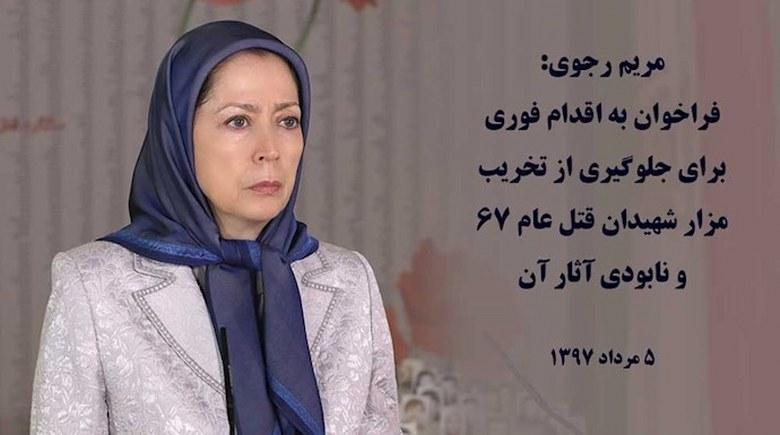بهدنبال اقدام رژیم ولایتفقیه برای محو هر گونه آثار قتلعام ۶۷ و پردهپوشی این جنایت فجیع، مریم رجوی، در تاریخ ۵مرداد۹۷ دبیرکل، شورای امنیت، شورا و کمیسر عالی حقوقبشر ملل متحد و عموم مراجع بینالمللی مدافع حقوقبشر را به اقدام فوری برای ممانعت از تخریب سیستماتیک مزار شهیدان قتلعام ۱۳۶۷ و نابودی آثار این قتلعام توسط فاشیسم دینی حاکم در سراسر کشور بهویژه در اهواز فراخواند.